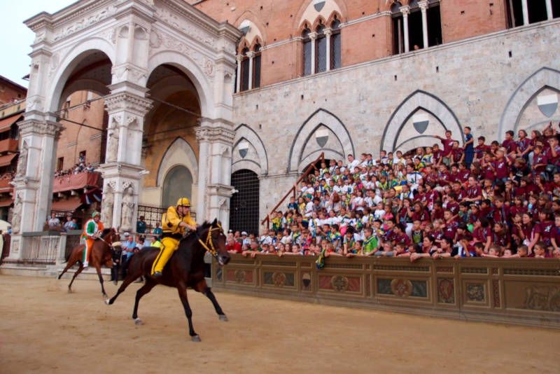 Ten horses and riders bareback and dressed in the appropriate colours represent the various Sienese contrade or areas in which the city is divided. Palio di Siena 2022 The Palio di Siena is a horse race that is held twice each year on 2 July and 16 August in Siena Italy. Legend of the Palio tour with exclusive Contrada Museum Private and Luxury from 7863 per adult price varies by group size Hunt for the 10 Treasures of Siena 11 Recommended Walking Tours from 5951 per group up to 5 Small-Group Brunello di Montalcino Wine-Tasting Trip from Siena 168 Recommended from 17002 per adult.