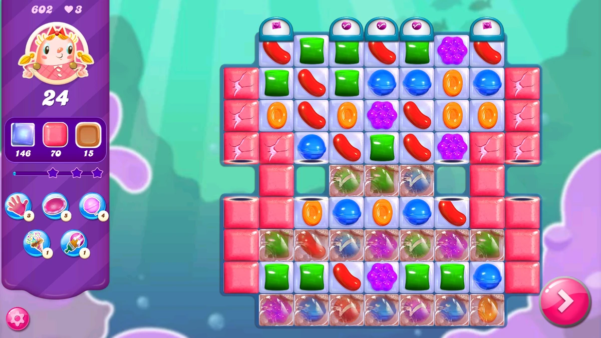 1 In Candy Crush Saga Level 602 you can clear frosting by making match to adjacent Candies. You have to crack the frosting to find 6 Pufflers. 1 star 18000 points.